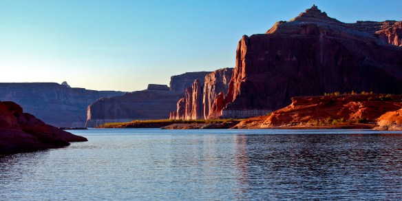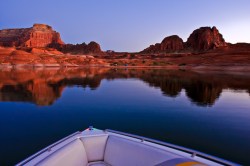 Sunset on Lake Powell. A few years back my wife and I went 40 miles up stream (Colorado River) and camped for three days. During sunset the red sandstone turns to a rich saturated red. The visual sensory excitement just overwhelms as the cliffs turn an Iron oxide deep red. It is absolutely overwhelming and beautiful. In these photographs we were heading back to our camp. I took two cameras a Canon 40D and a Hasselblad film camera on the trip. The bow of the boat photo was taken with the digital 40D.