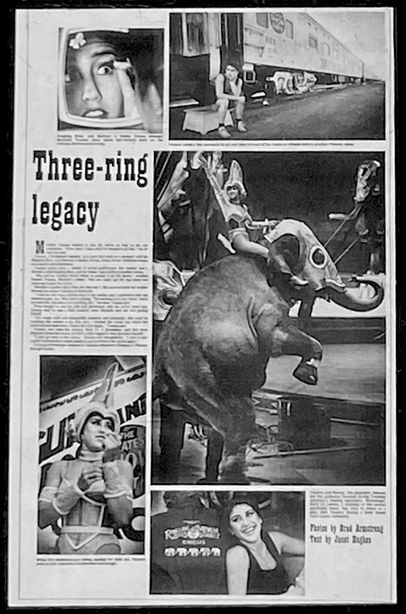 I was assigned to photograph the Ringling Bros. and Barnum & Bailey Circus in downtown Phoenix. In journalism, you’re required to get names, and when I found out the showgirl riding the elephant was Michelle Youens, 19, of Scottsdale, Arizona, I instantly thought, there’s a story here.