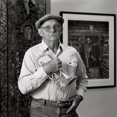 My friend, photographer and Guggenheim Fellow Jay Dusard with his favorite instrument. Jay was an iconic Arizona portraitist and documentary photographer. He photographed the North American cowboy and cowgirl’s of the western United States. From Northern Mexico to Montana he made portraits that will stand the test of time way beyond his years. When I made this portrait in 2006 I asked him what is closest to your heart beyond photography. He said, it was music and his Cornet. I asked him to stand for the portrait embracing his Cornet. Behind Jay is one of his iconic portrait of Julie Hagen, Wagstaff Land & Cattle Company, Wyoming 1981. Jay passed away Sept. 20, 2025. He was 88 years old. RIP Jay Dusard!