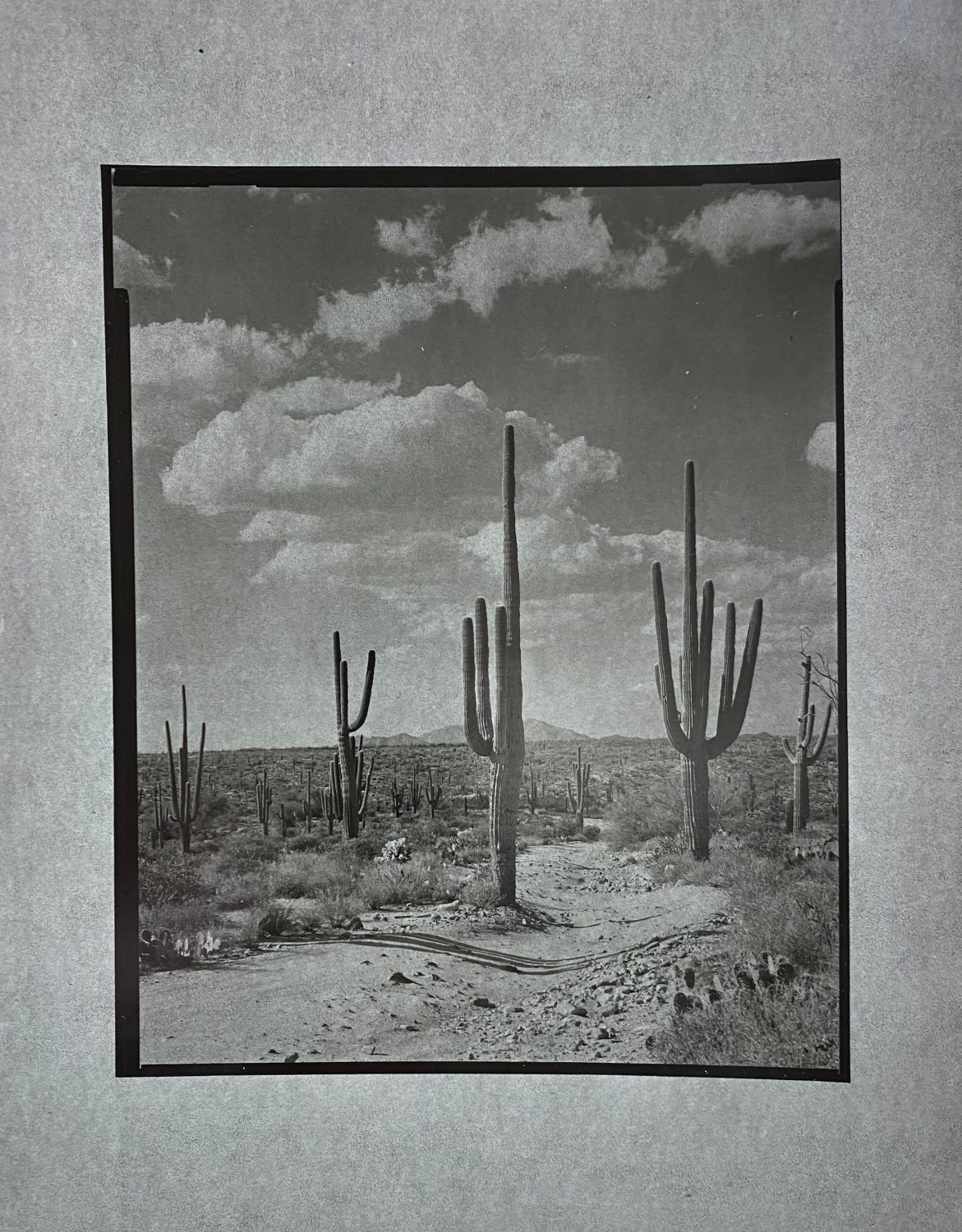 About five years ago, or perhaps a bit more or less—I’m losing track of time these days—I used to drive out to the Four Peaks Wilderness area, navigating four-wheel-drive roads while exploring the landscape and seeking out Saguaros to photograph. In regards to this particular landscape photo, I occasionally incorporate roads into my compositions. While I don’t categorize myself strictly as a landscape photographer, I do consider myself a photographer with diverse interests, and landscape photography is among them. My rationale for including roads is to capture the human presence in the landscape. I’m unsure if there’s a specific term for it, but I refer to these as editorial landscapes. A couple of years after taking this picture, a devastating brush fire swept through the area. I haven’t returned since the fire, but I hope the giant Saguaros survived. This photograph is a silver gelatin darkroom print from an 8×10 inch negative. The grayish print was made with old paper that was severely fogged from heat and age. I included itin this post because I thought it was somewhat of a happy accident.